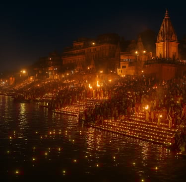 From Assi Ghat to Rajghat, more than one million diyas are lit, turning the ghats into a golden river of light. The reflection on the Ganges creates a surreal and divine spectacle.